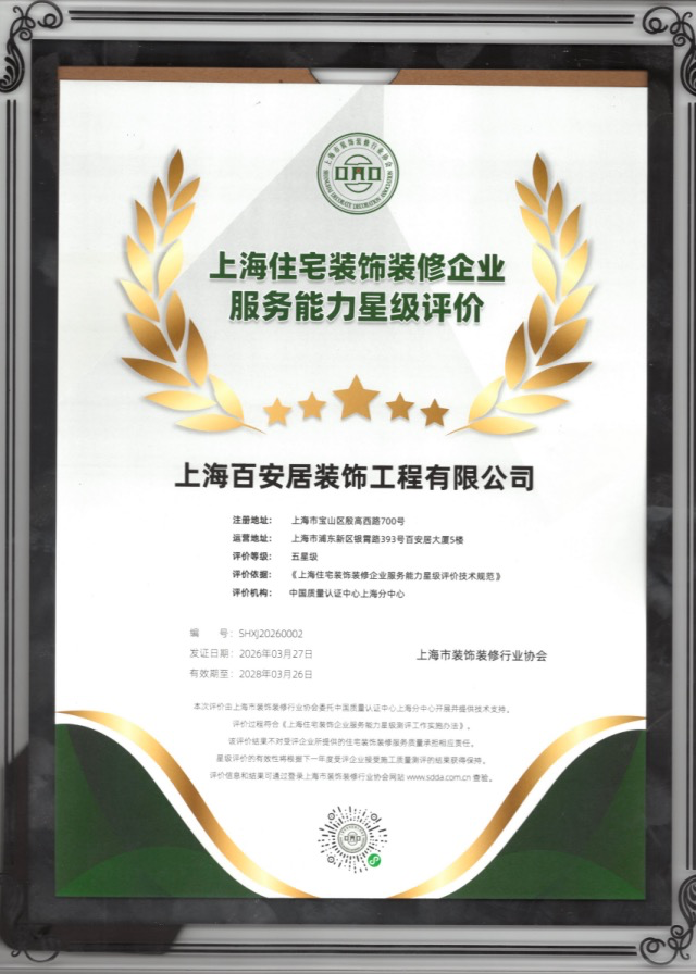 历经前期体系审核与现场实地核查双重严苛考评,百安居凭借过硬综合实力脱颖而出,成功斩获“上海住宅装饰装修企业服务能力五星认证”。长久以来,百安居以规范化管理架构为根基,现已构建覆盖设计、施工、交付的全生命周期管理体系,从源头到交付严守品质防线;并坚持以客户为中心,常态化开展客户满意度回访,持续优化服务体验,用完善的服务闭环与扎实的交付能力,诠释五星认证背后的品牌担当,也为行业树立了高品质家装服务的实践典范。